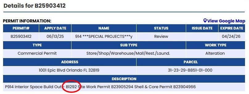 Permit notes have been updated though, showing that this project, known as Project 914, does in fact have a building number. It is Building 1292. This is different from the plans for the original building’s designation, which was 1290. That original building was designed as a food court before being canceled and replaced with this new split dining concept instead.