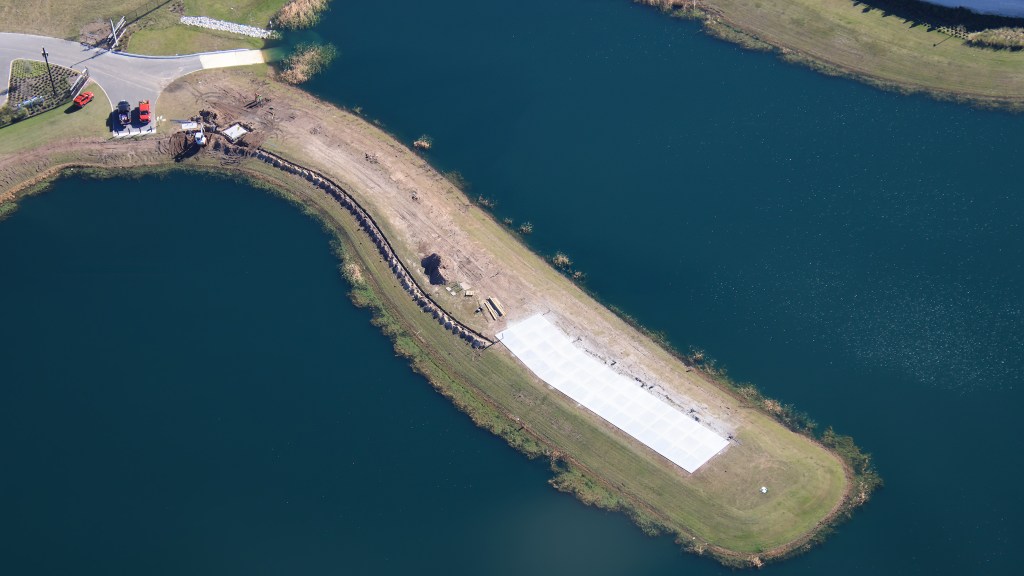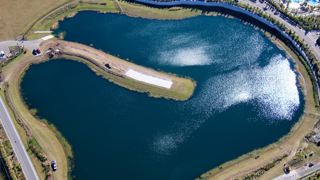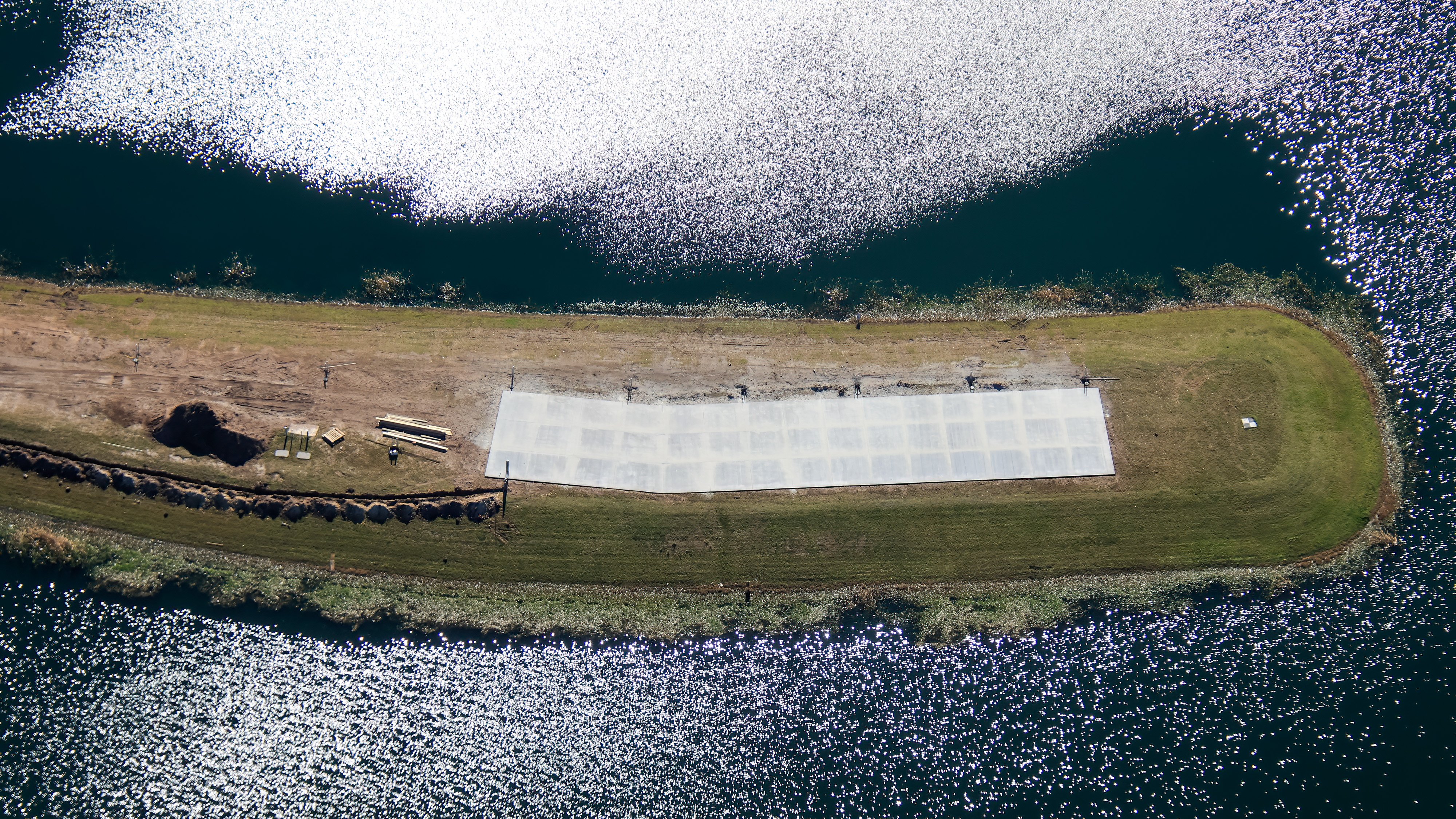 These aerial photos from Bioreconstruct show how concrete has been poured on the little peninsula in the center of the drainage pond located behind the park, on the opposite side of the Universal Helios Grand Hotel.