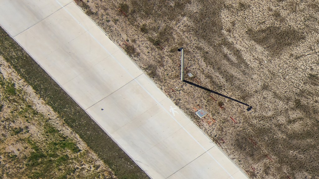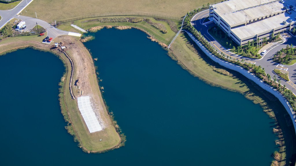 A trench was dug out, perhaps to run cables between the future launchpad to a future control booth? It’s not yet clear, but the trench does connect the new concrete pad in the center of the pond to a smaller pad near the shore.