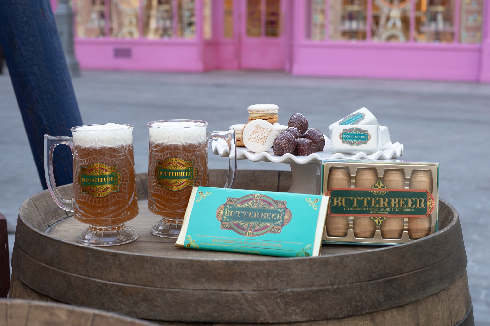 The new Butterbeer products include macarons, truffles, candy bars, and caramel-filled Butterbeer-flavored chocolate barrels, in addition to new steins when ordering Butterbeer, and the previously announced Butterbeer crepe.