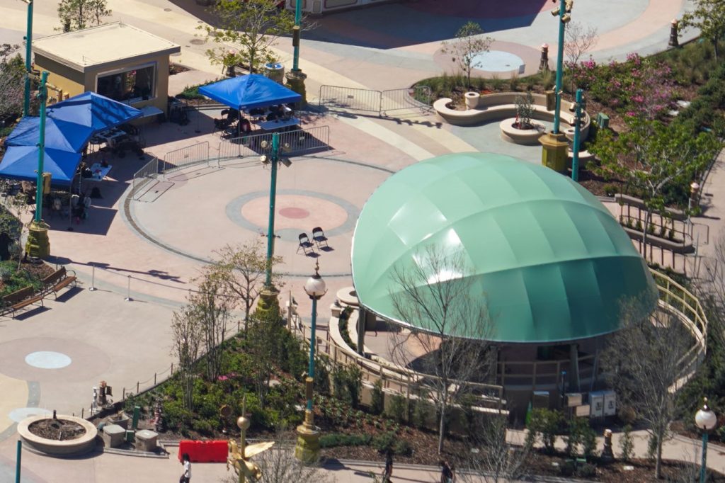 Some areas are still blocked off as construction projects continue around the park, like the shops and guest services here on the right side of the park’s entrance area within Celestial Park.