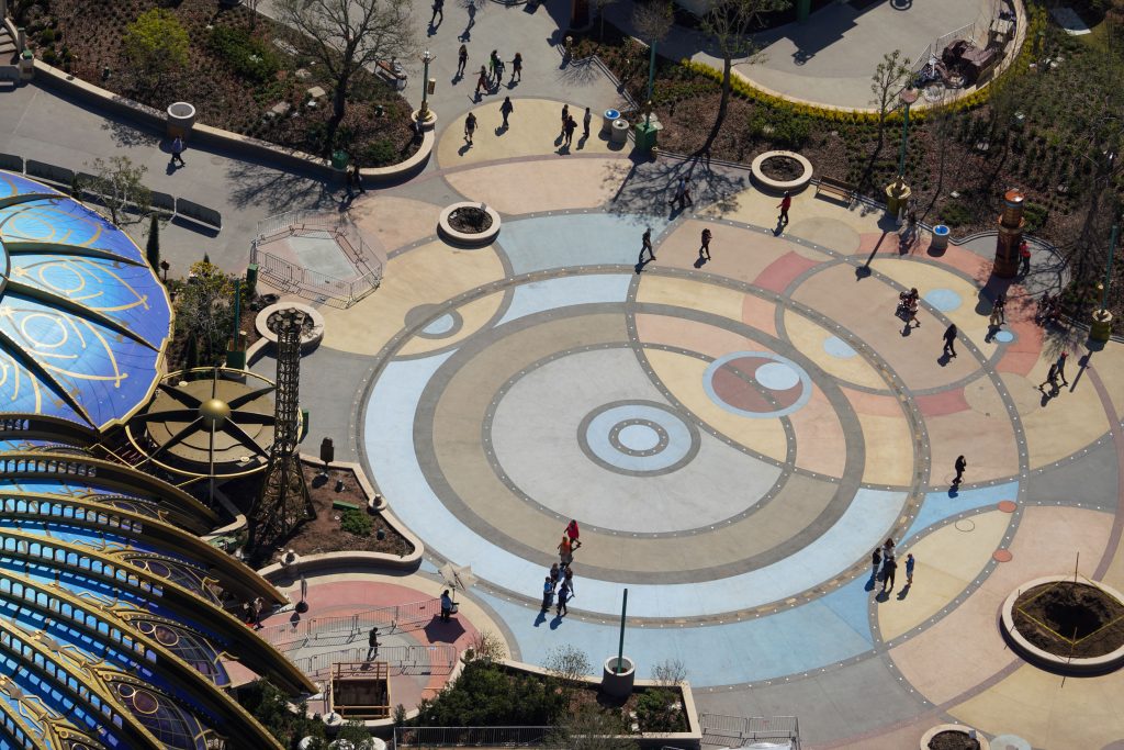 Here we can see how the landscaping is extending a comet-inspired pavement design in front of the ride.