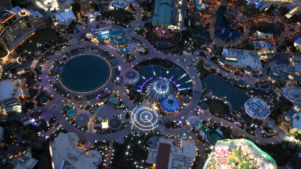 This large fountain display is using its water to almost mimic the same style of dome as Constellation Carousel, creating two domes across the night sky’s skyline.