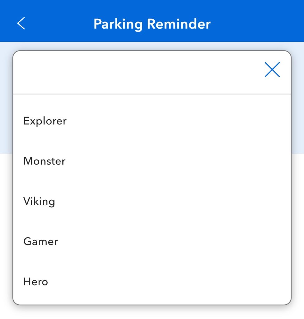 The Parking Reminders section of the app shows the names for each of the parking sections of the flat parking lot, which are named: Explorer, Monster, Viking, Gamer, and Hero.