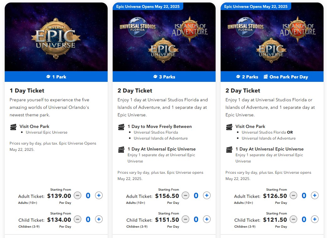 Single day tickets for Epic Universe range from $139 to $199 each, depending on the date. They debuted this morning, with availability starting from June 1st through the end of the year. No dates were available in May for this ticket type, including opening day.