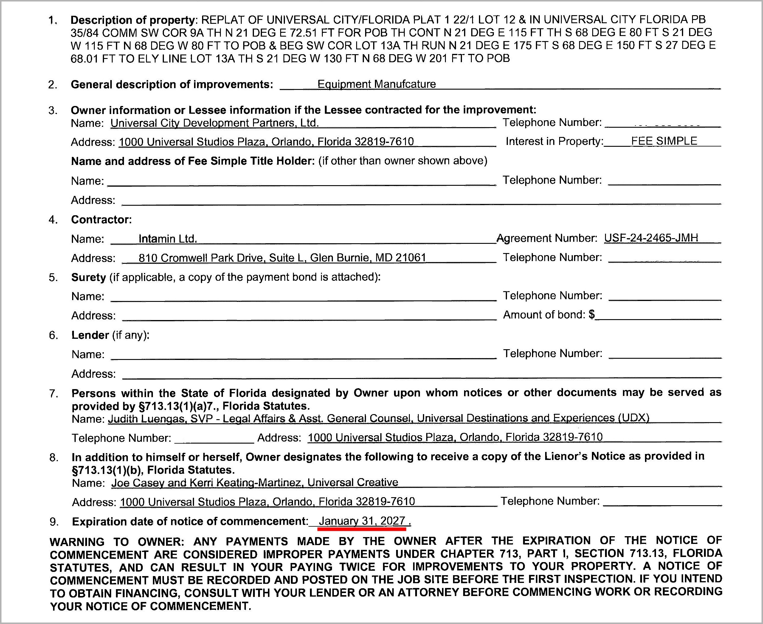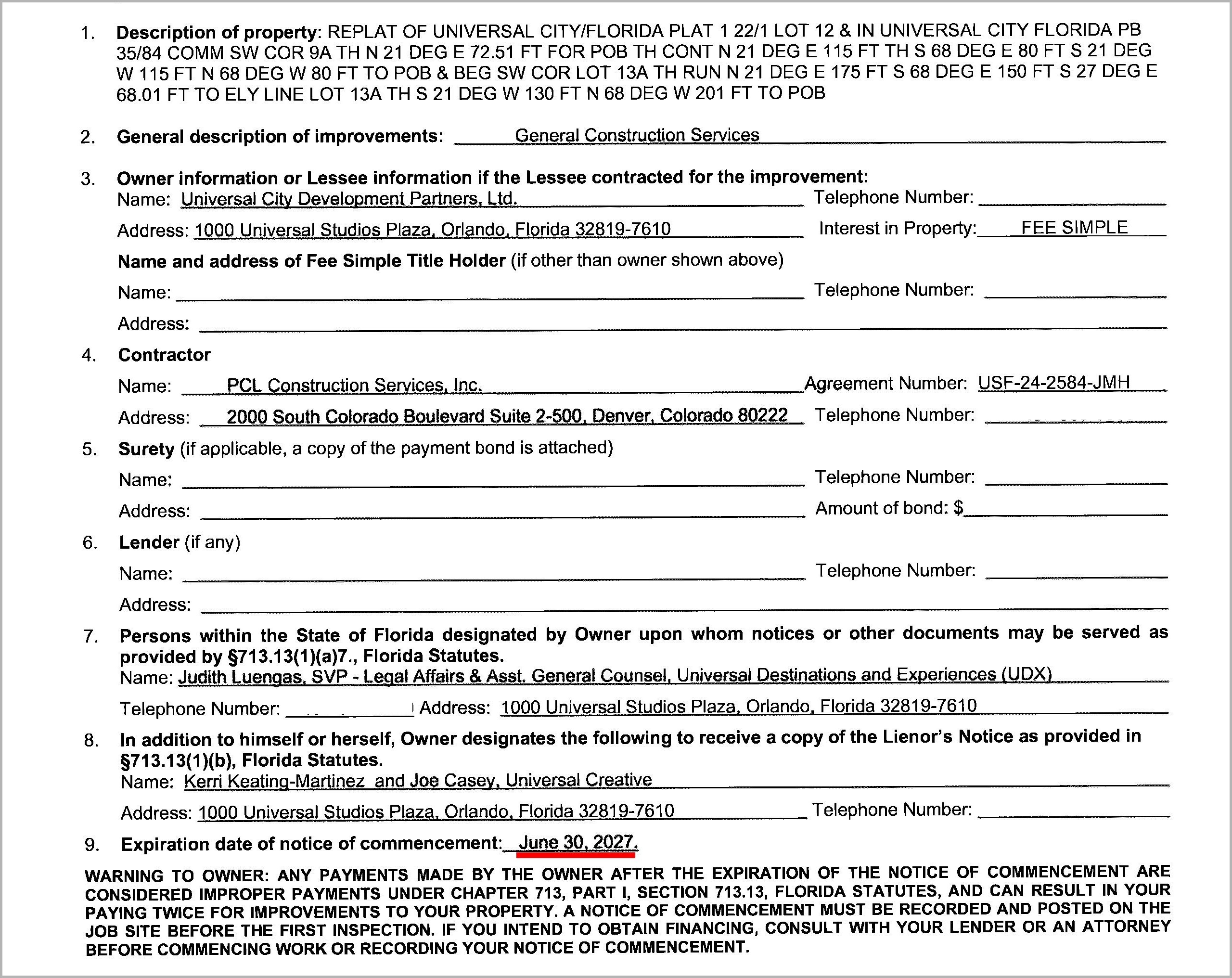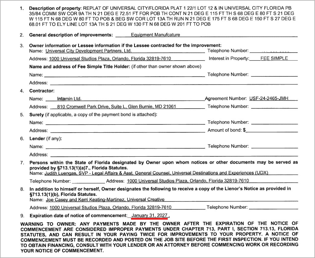 That date is noteworthy, as Notices of Commencement filed with the Orange County default to one year from application date when the expiration is not filled out specifically. Multiple documents show June 30, 2027 as the end date, despite being filed months apart.