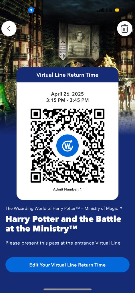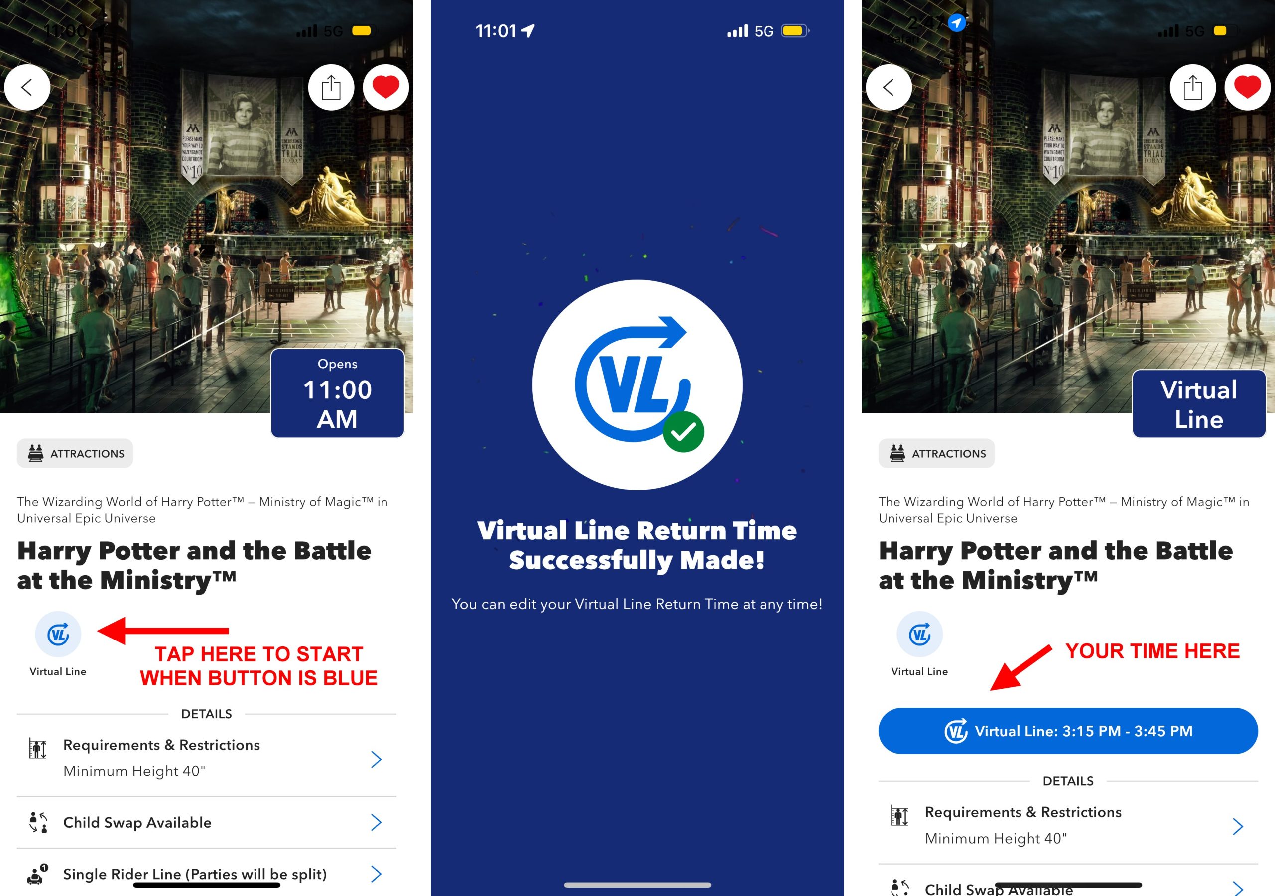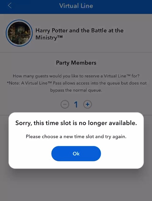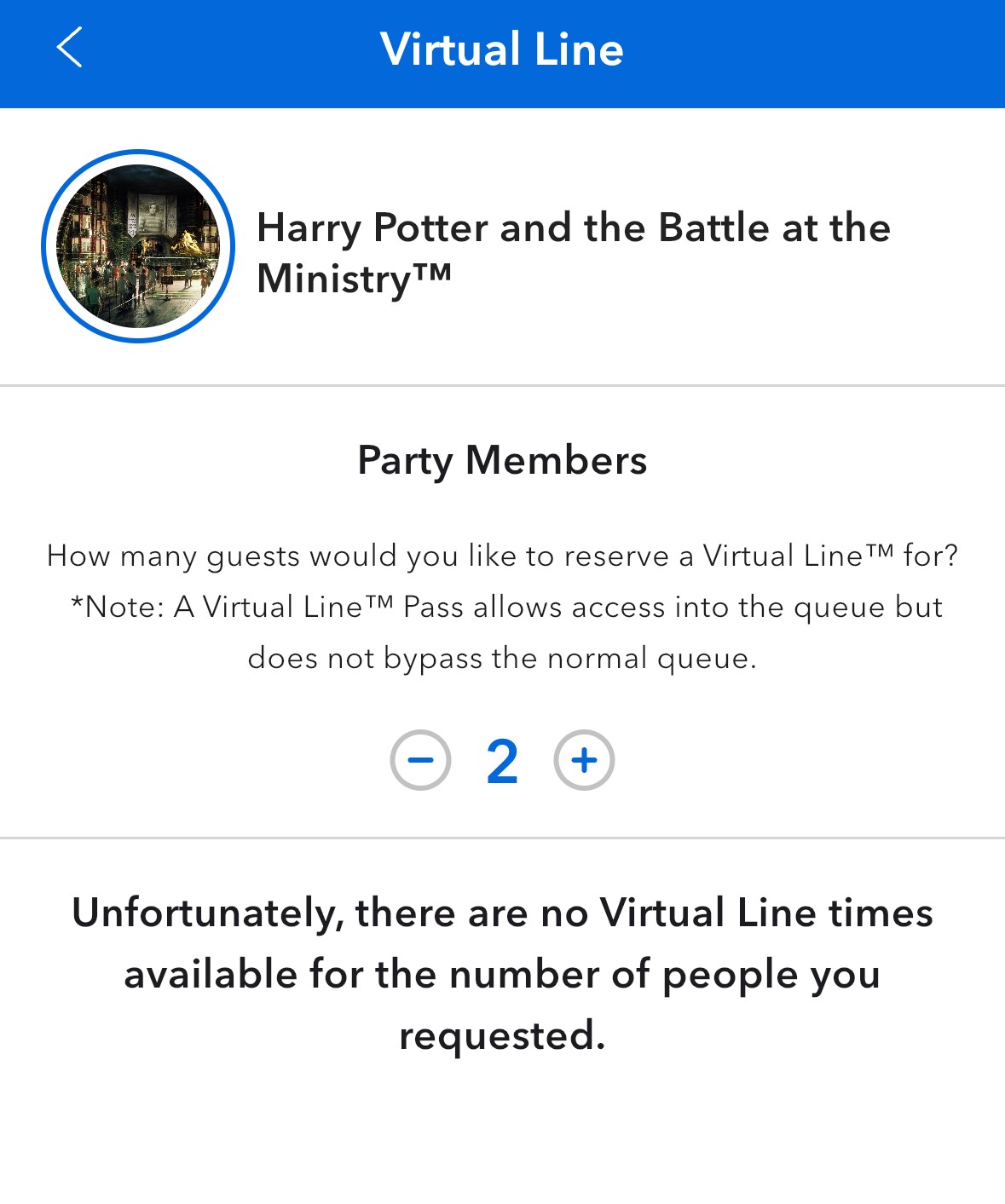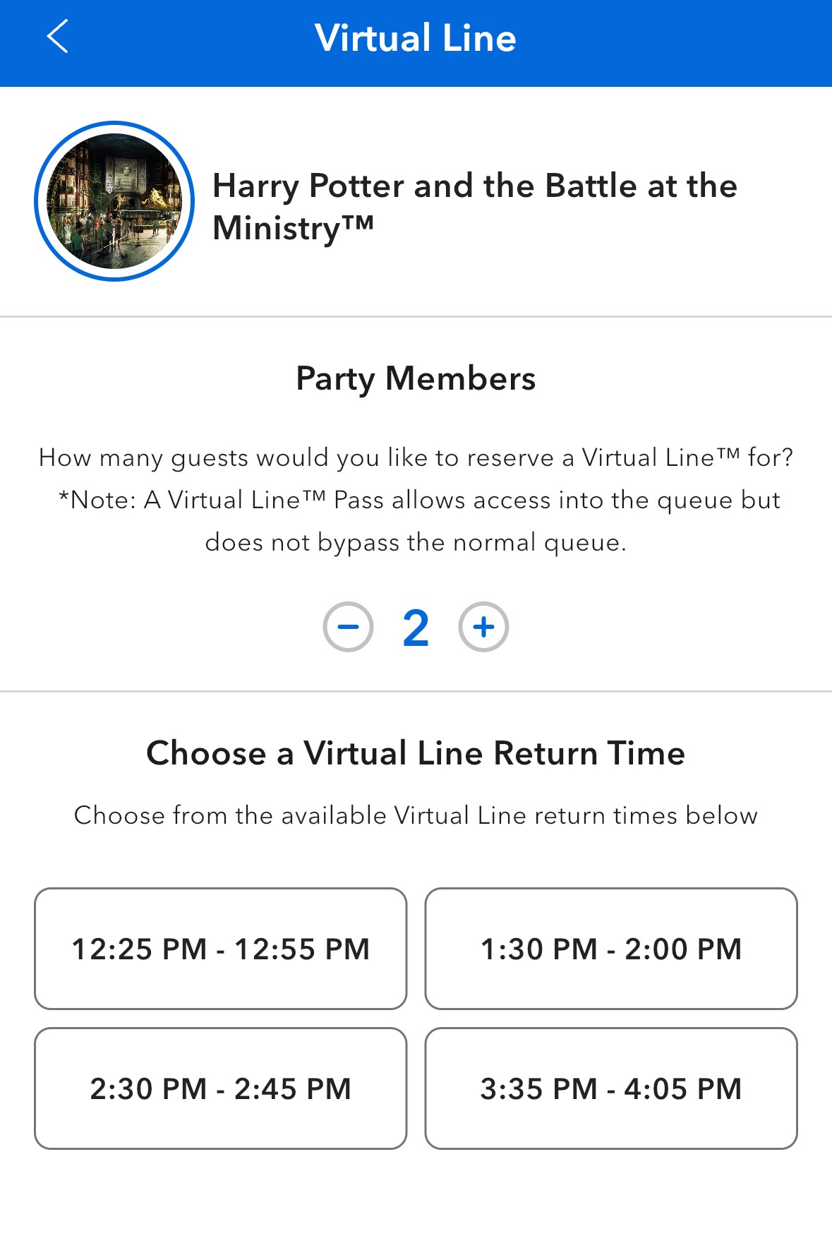 1. Go to attraction page for Battle at the Ministry in the app at drop time. If Virtual Line button is not blue yet, go back a page and return until it is.
